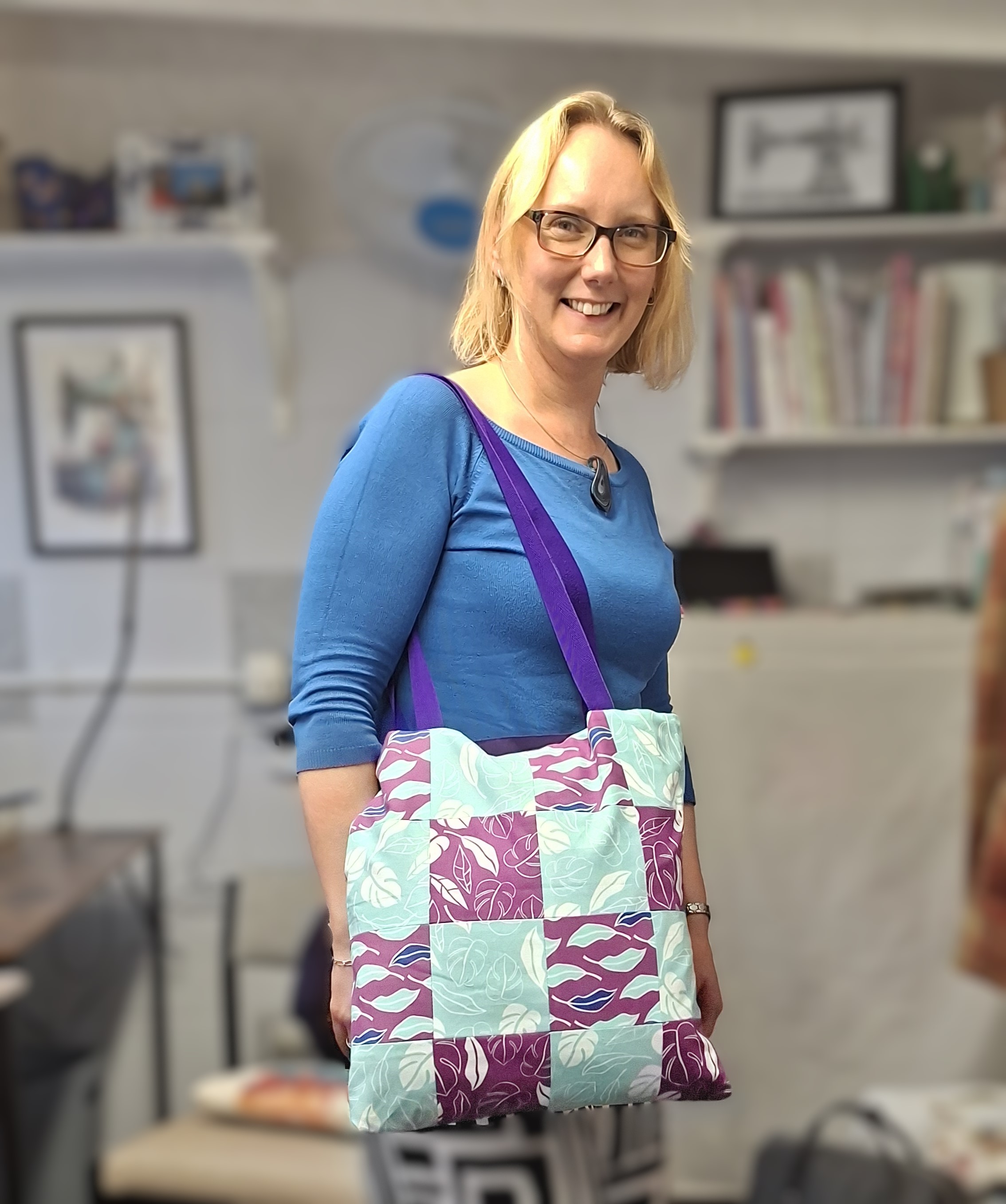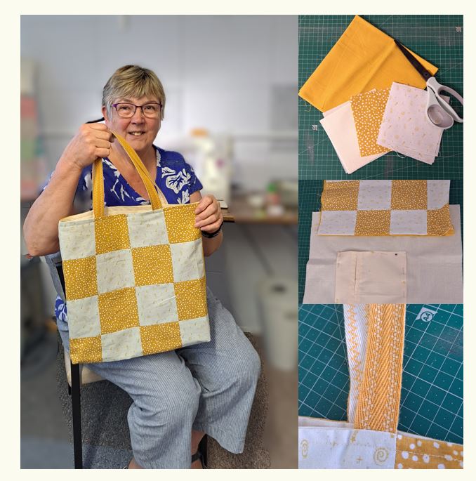 Another Susan, bringing together a patchwork tote bag. Susan is working on the calico lining in this photo, inserting a zipped pocket that will sit inside the bag, adding a handy little safe space for keys or a mobile.