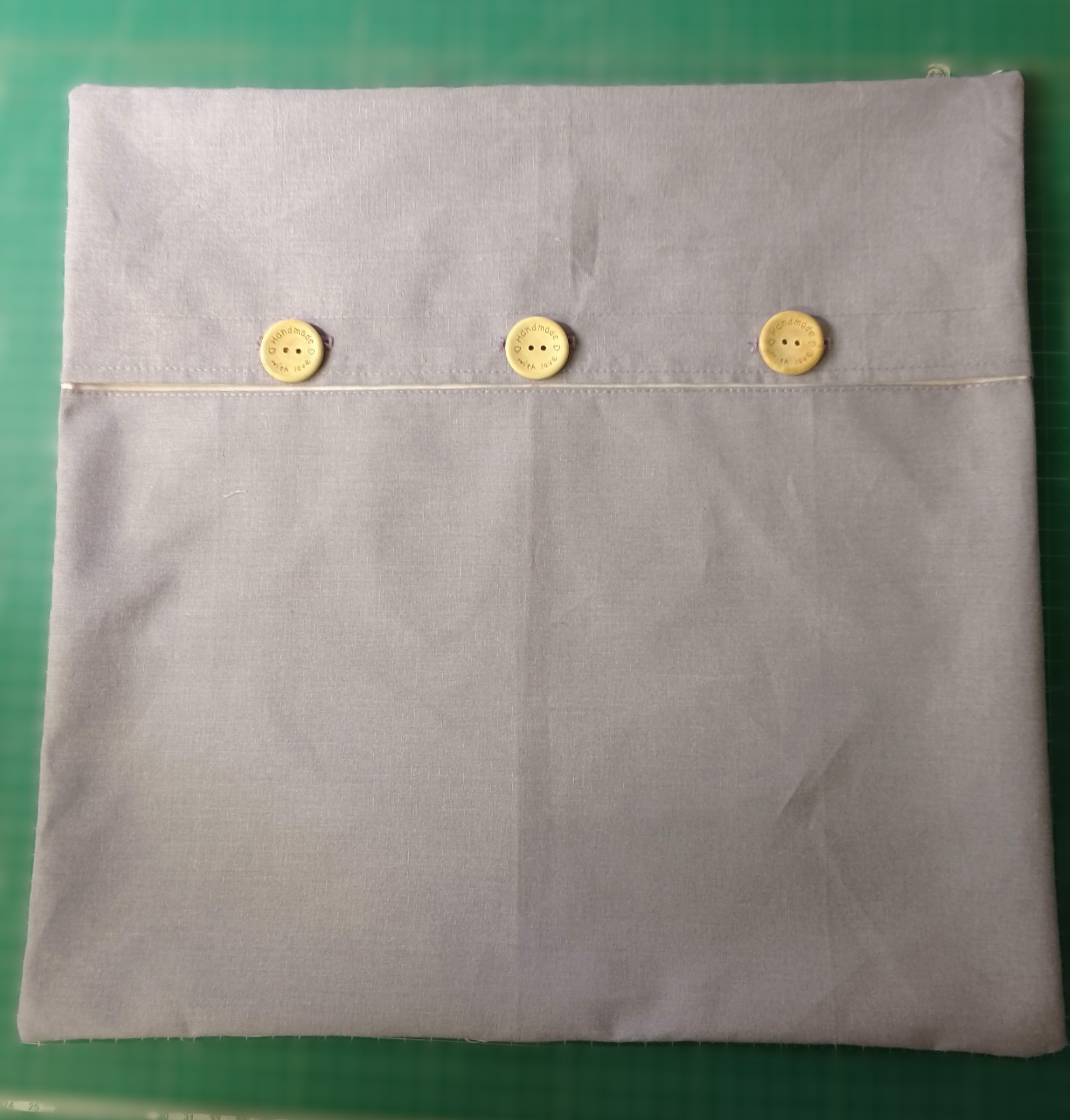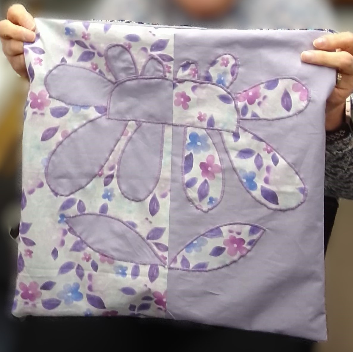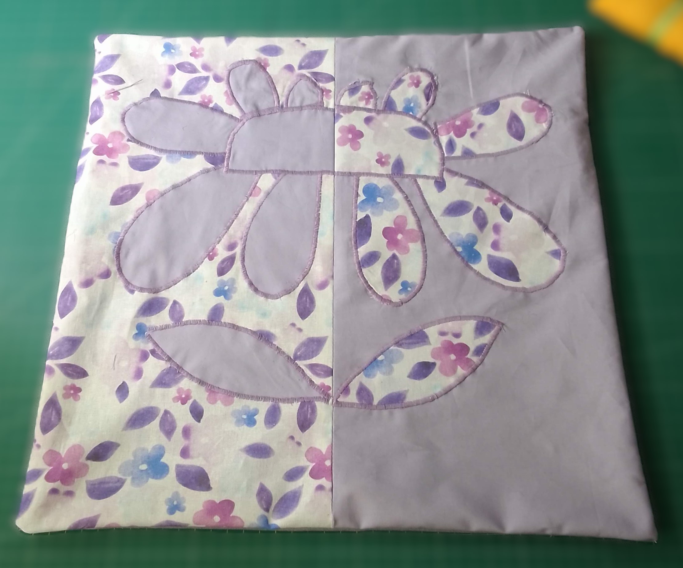 This applique cushion cover was designed by Susan to match her bedroom colours. Her first attempt and it is so good, the back is fastened with three wooden buttons.