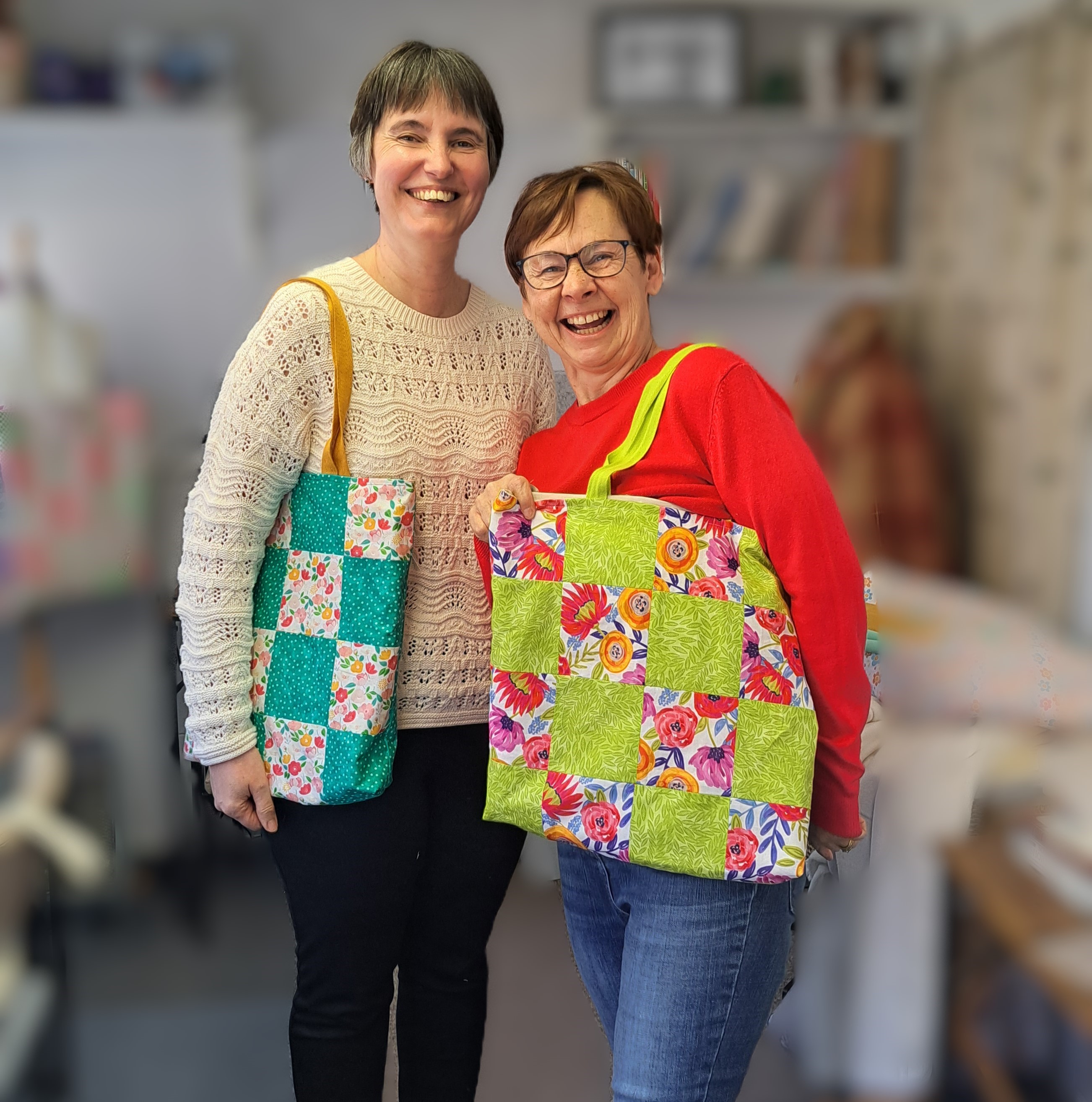 Two fabulous patchwork totes sewn together by two super ladies, so well done and with little and no sewing knowledge – absolutely great. Fabric from 1st For Fabrics.