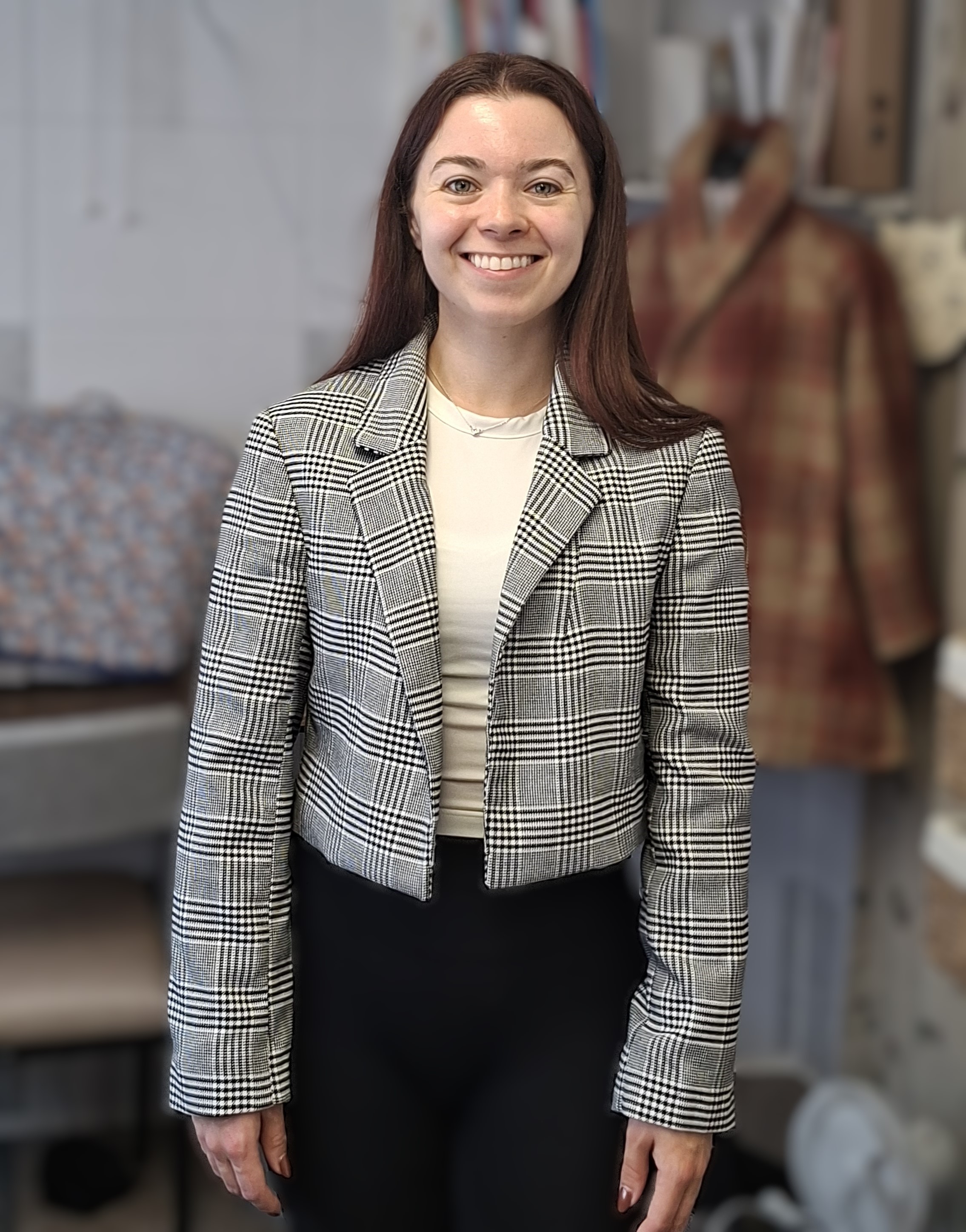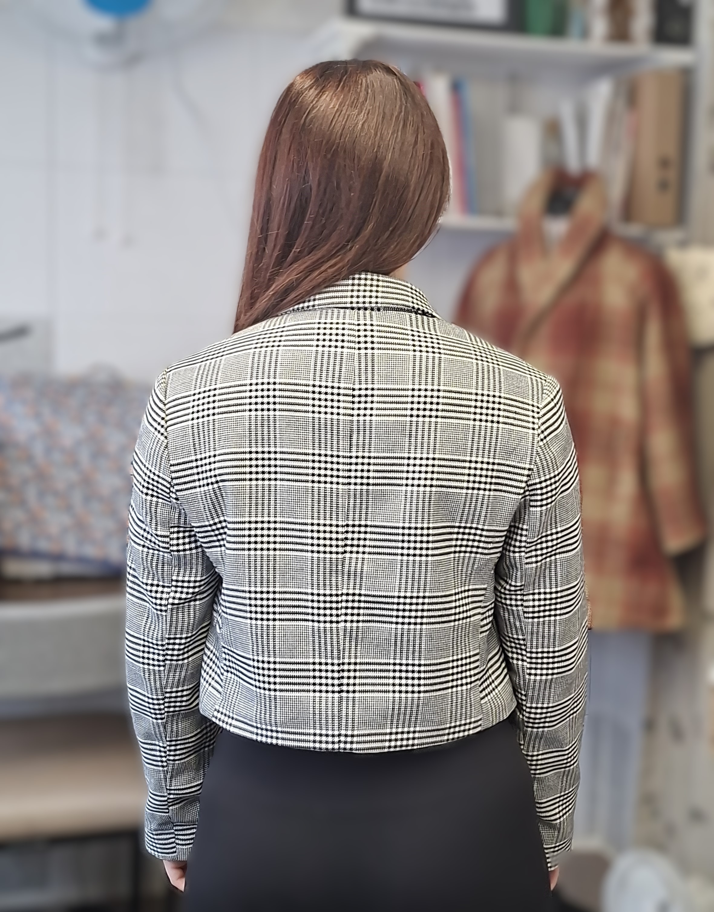This is an amazing transformation, from a long boxed jacket to a stylish short one. Danielle did a fab job on this upcycle.