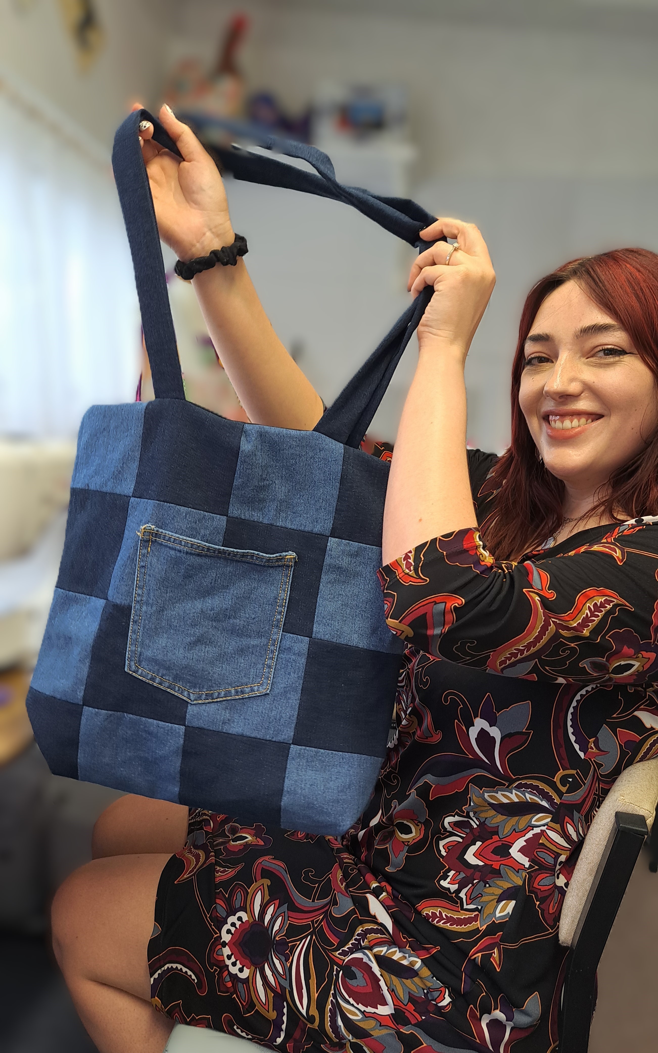 Denim Tote bag in the making and the fabulous finished product. Freya brought her vision to the workshop and absolutely nailed it.