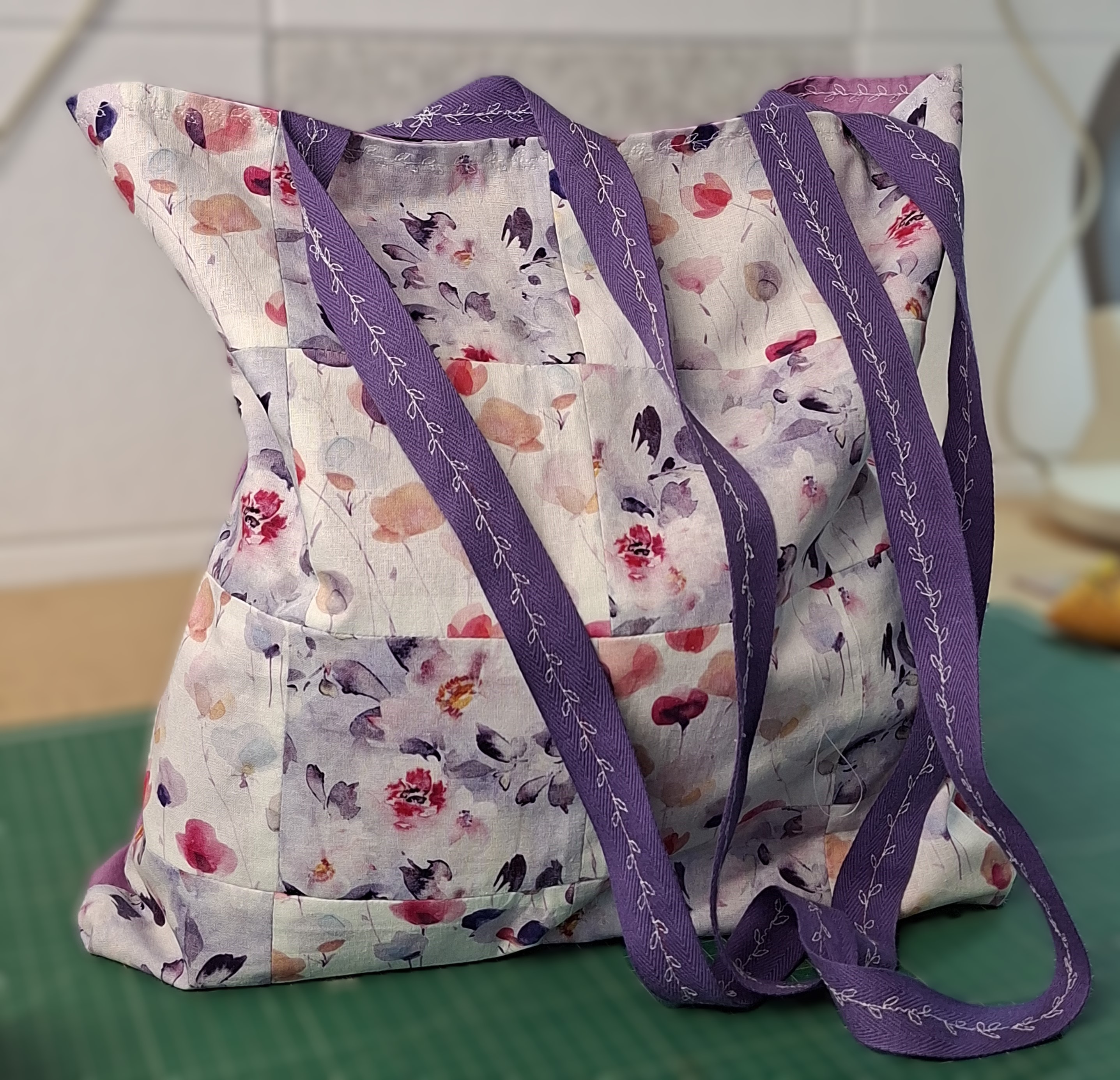 This tote has rekindled Susan’s sewing bug! The patchwork enabled her to work on precise sewing to match up the squares. Susan included an inside zipped pocket, finishing the bag with a fabulous creative stitch on the straps.