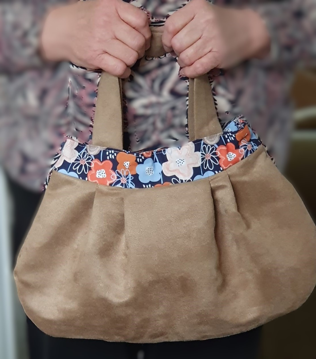 Another fab bag created by Susan, with four pleats back and front, all lined and Susan’s choice of fabric (suedette and patterned cotton) is a great match. Again a super made bag.